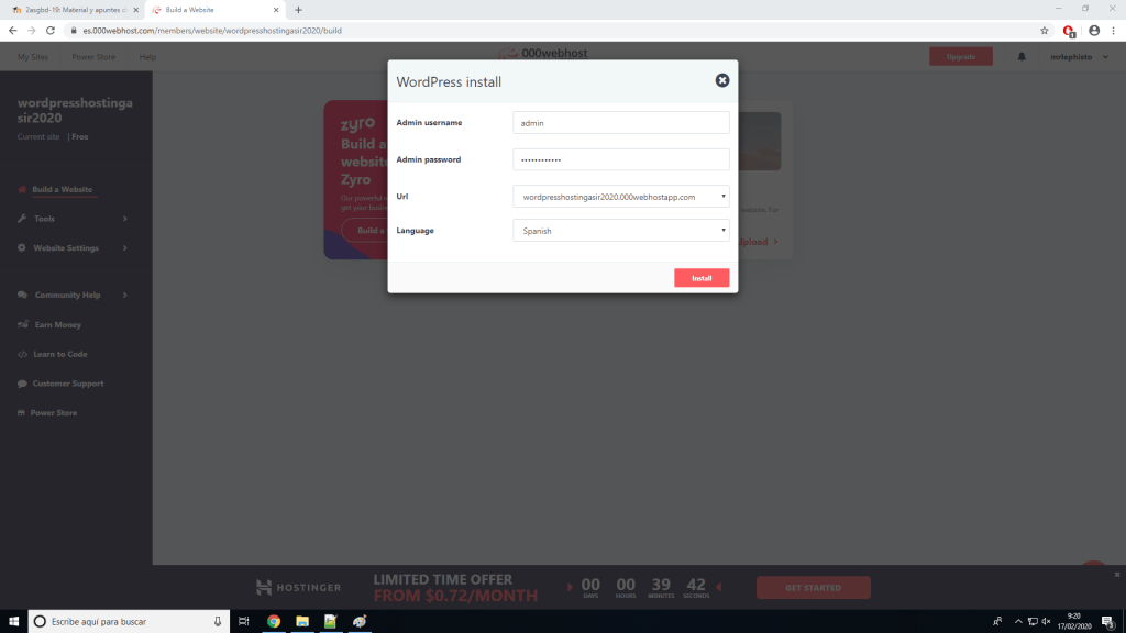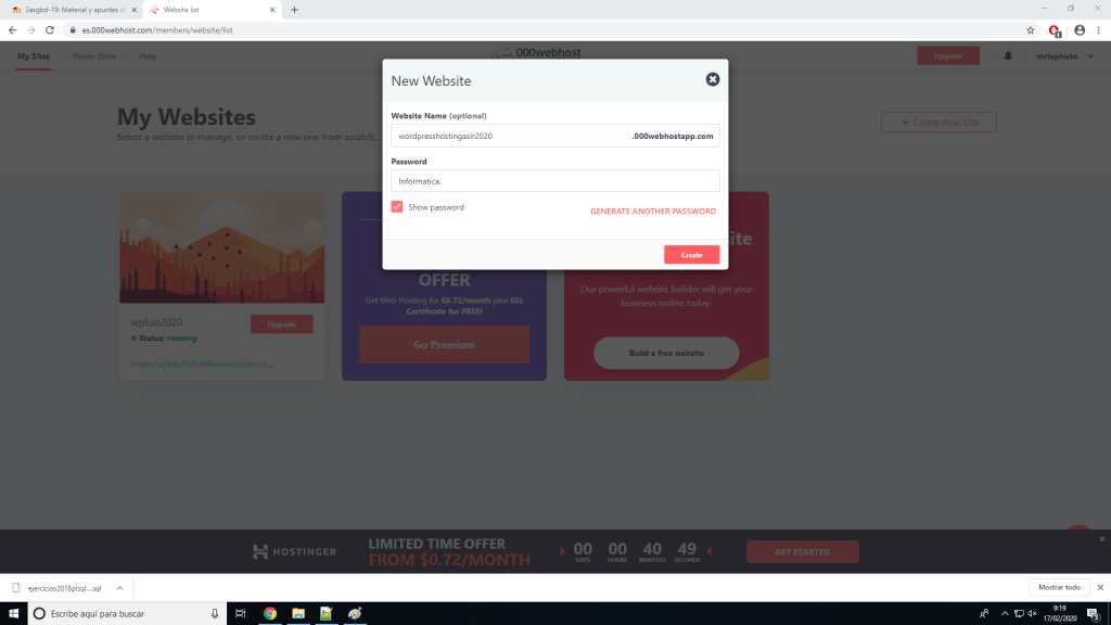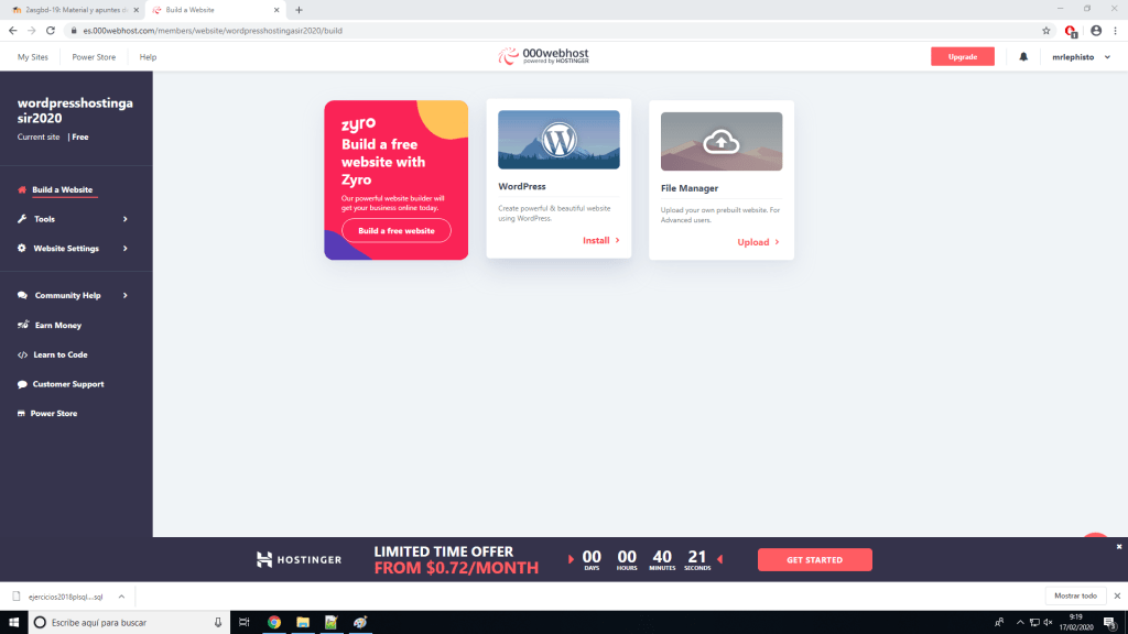 Si no queremos tener nuestra página de WordPress en nuestra propia máquina por cualquier razón hay muchos sitios en internet donde podemos alojarla. Para este ejemplo usaremos 000webhost, que se puede usar gratuitamente. Una vez nos hemos registrado en la página podemos crear un sitio web.