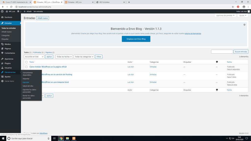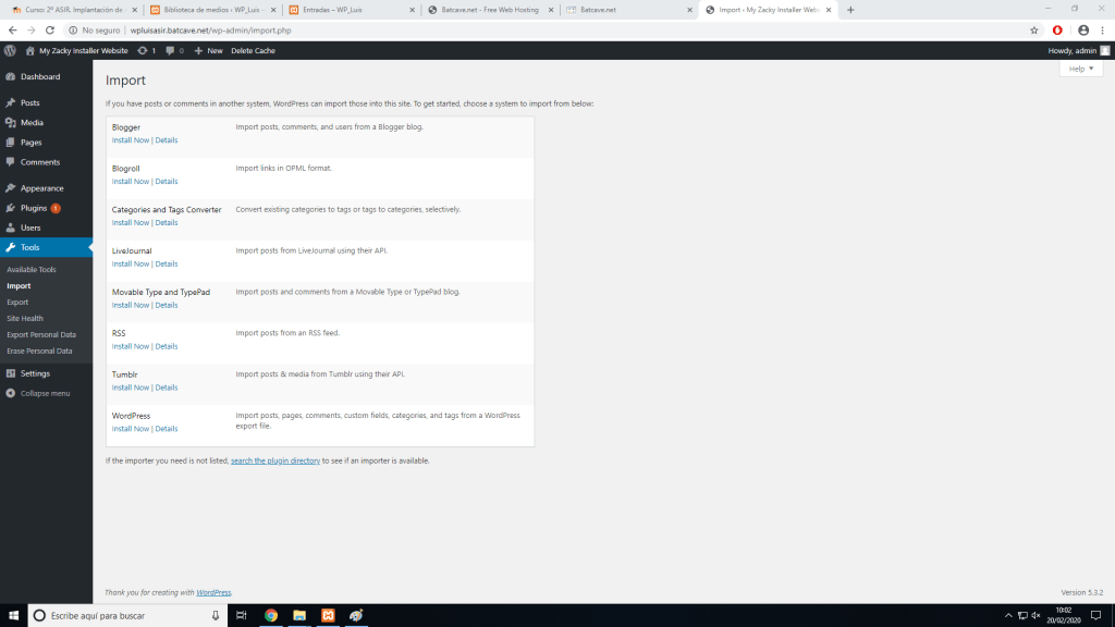 En el nuevo sitio le damos a importar en herramietas e instalamos el importador de WordPress, y luego lo ejecutamos.