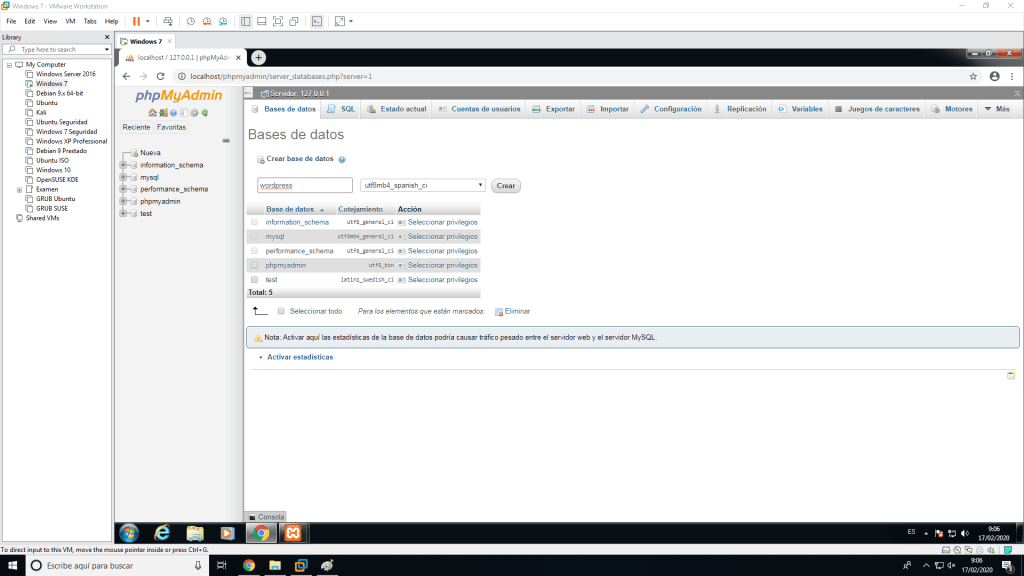 Una vez hecho esto tenemos que preparar la base de datos que va a usar WordPress. Para ello usando nuestro gestor de bases de datos creamos una base de datos nueva.