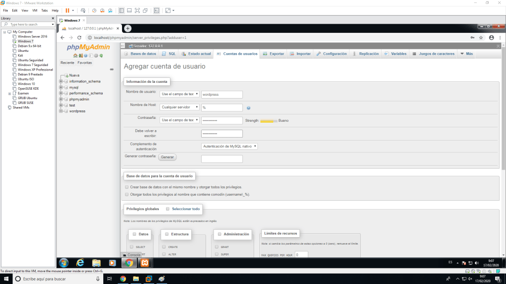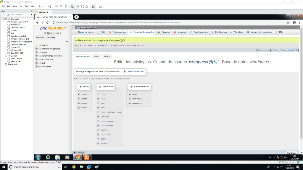 Después tenemos que crear un usuario para WordPress con todos los permisos sobre la base de datos que hemos creado.