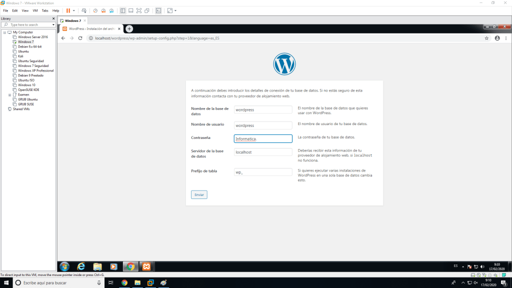 Una vez hecho esto accedemos a la página web de nuestro WordPess local y tendremos que decirle el usuario y la contraseña del usuario que hemos creado para que pueda administrar la base de datos de WordPress.